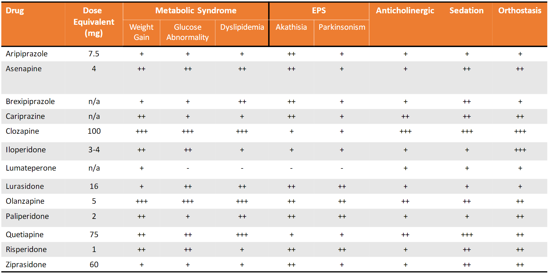 Below is a table of the FDA approved SGAs and characteristics relating to each medication. You can compare the frequency of side effects with the FGA medication table above.