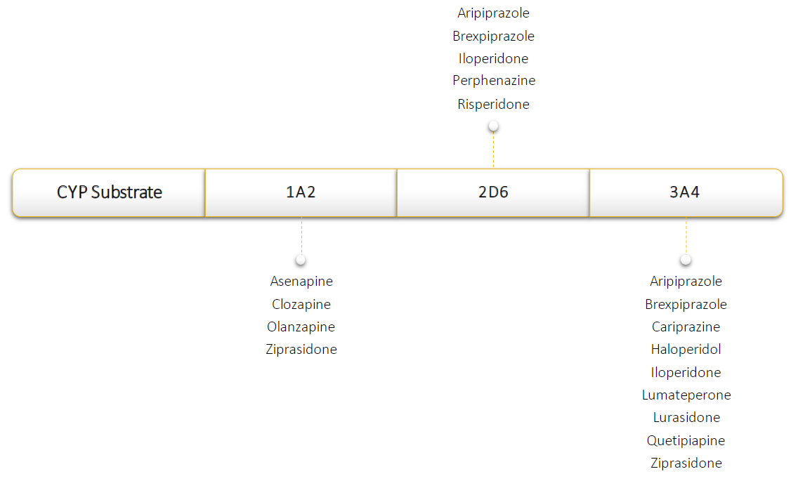 Below is a figure of the antipsychotic medications and which CYP enzymes they are substrates for: