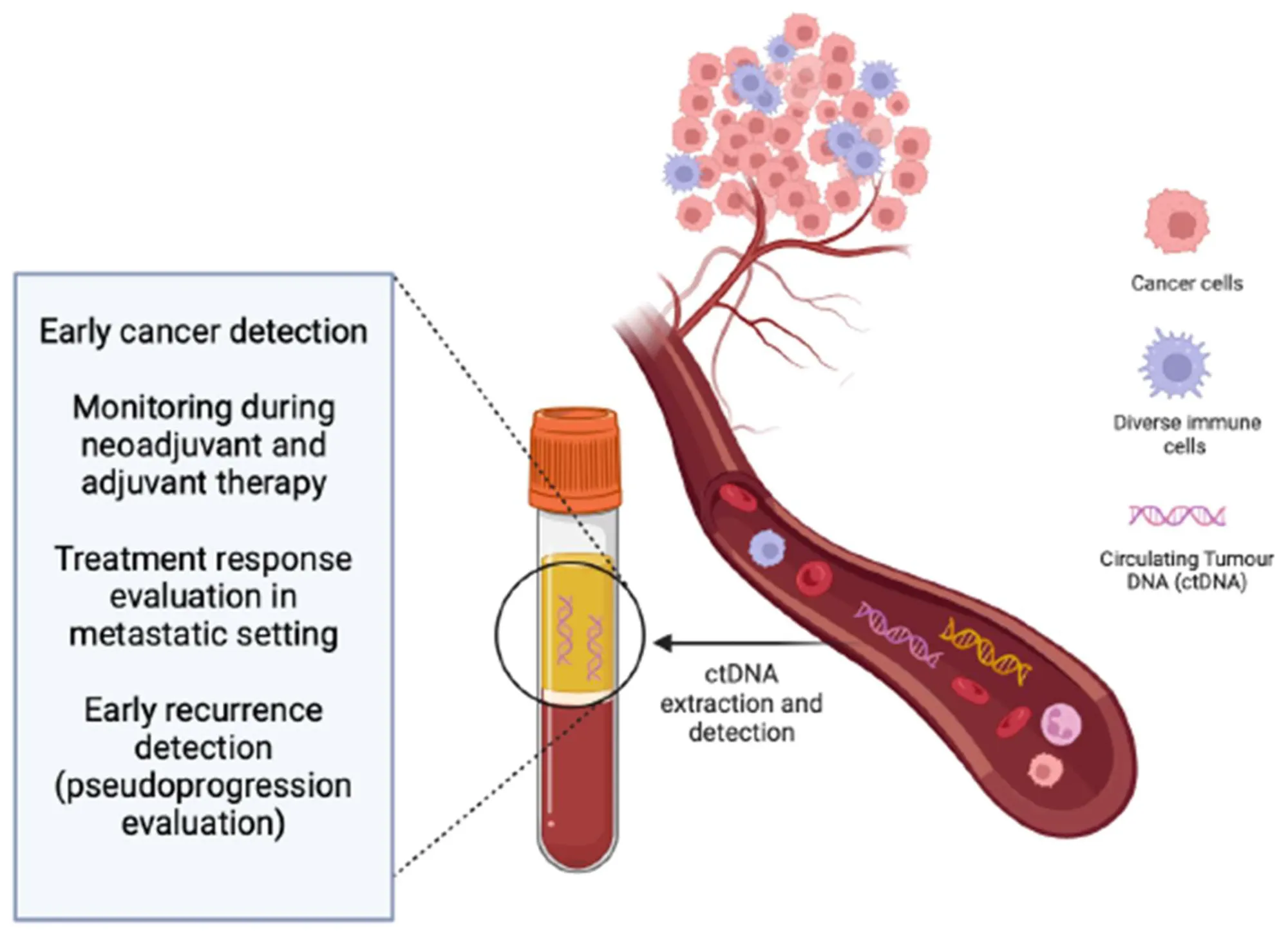 ctDNA analysis, often termed liquid biopsy, offers a non-invasive alternative to traditional tissue biopsy, allowing dynamic, real-time molecular profiling of cancer. ctDNA has potential applications across the entire cancer continuum, including early detection, molecular diagnostics, treatment selection, minimal residual disease (MRD) assessment, and relapse prediction.