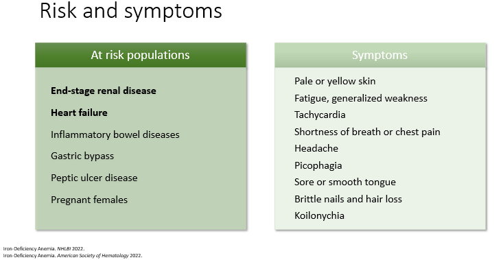 - Risk factors for ID/IDA in CKD: blood loss, chronic inflammation, impaired iron absorption