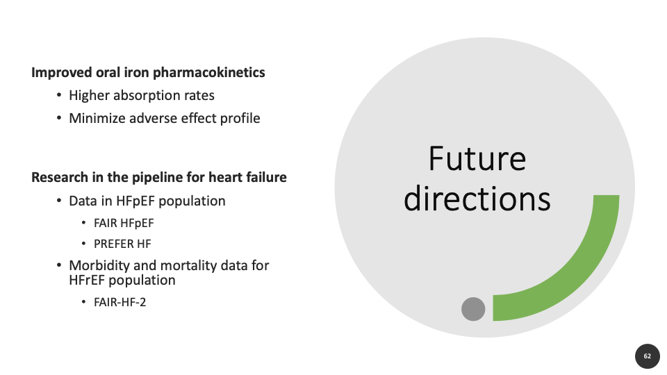 Key takeaway: The studies found that high-dose PO iron did not increase exercise capacity but did increase hemoglobin. Meanwhile, IV iron increased exercise capacity, QoL, NYHA class, and hemoglobin. The AFFIRM 2020 was the first trial to show that IV iron supplementation reduced hospitalizations in patients with LVEF <50% and who were stabilized after an episode of acute heart failure. Note, there is no data on mortality at this time.