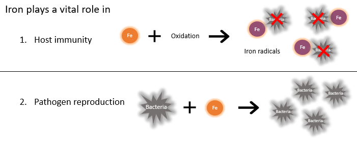 We will first address what role iron has in immunity. Iron molecules can become oxidized, form iron radicals, and kill bacteria. However, bacteria can also use free iron molecules in the blood stream to aid in reproduction. See the graphic below for a visual representation.