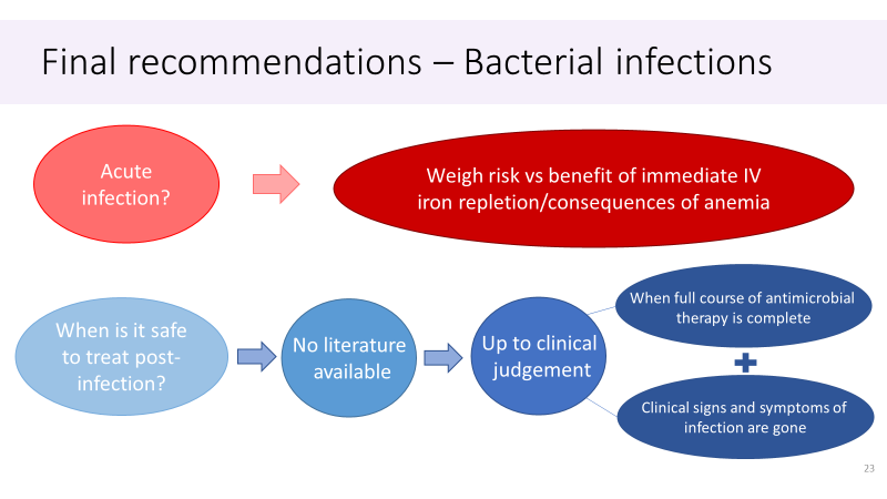 - Mixed literature on infection risk with iron, and clinical judgement should be used on severity of symptoms ± anemia and patient specific factors