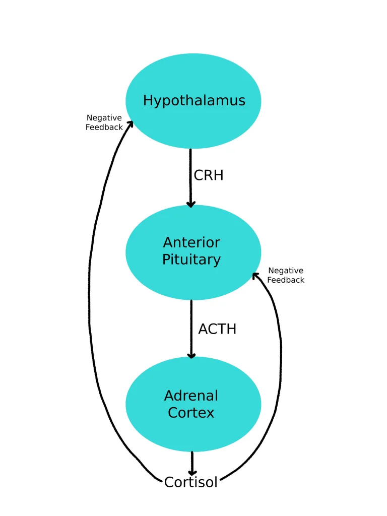 Normally, the hypothalamus releases corticotropin-releasing hormone (CRH), which stimulates the anterior pituitary to produce adrenocorticotropic hormone (ACTH). ACTH then prompts the adrenal glands to release cortisol. Increasing cortisol levels communicate with the hypothalamus and pituitary glands, signaling them to reduce CRH and ACTH production – a classic negative feedback loop!