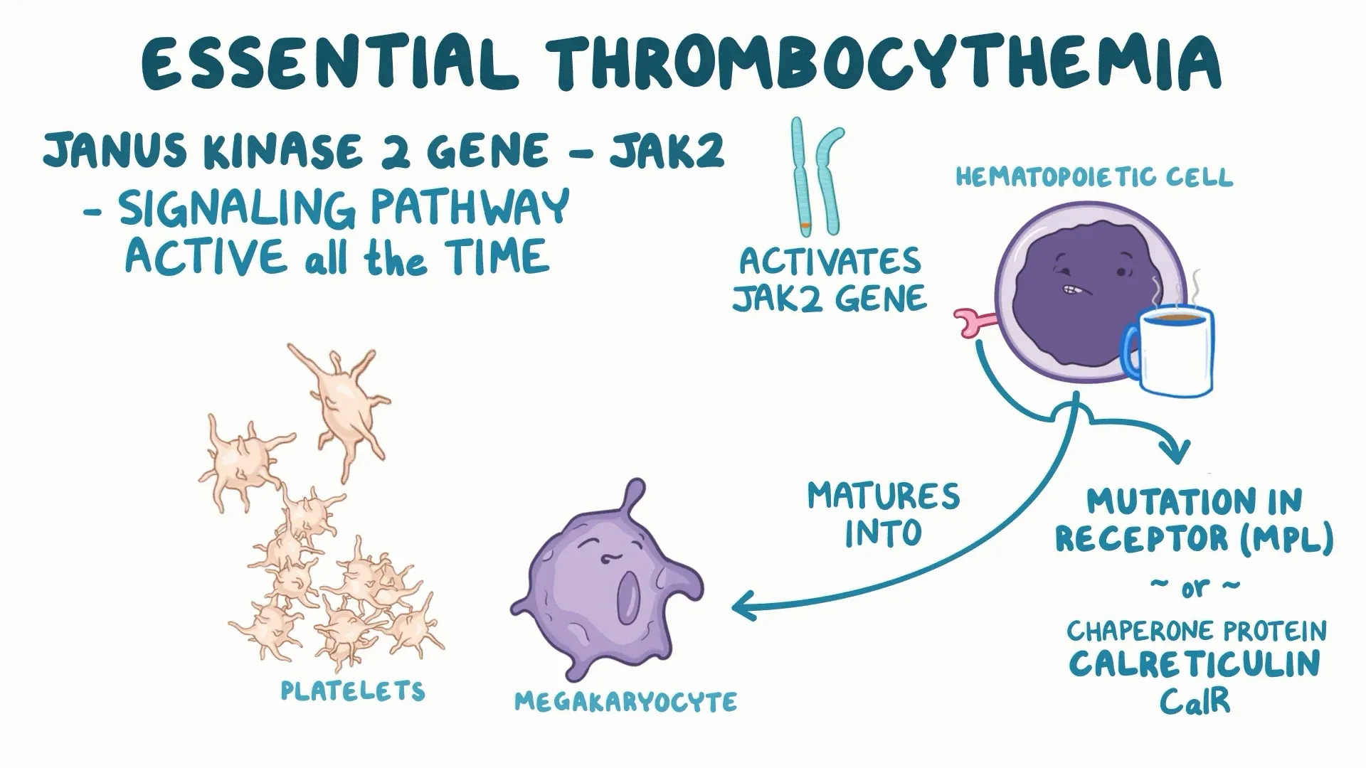 - These mutations activate JAK–STAT signaling, promoting megakaryocyte proliferation and increased platelet production. Mutation type influences clinical phenotype (e.g., JAK2-mutated patients have higher thrombotic risk; CALR-mutated patients often have higher platelet counts but lower thrombosis risk)