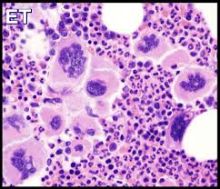 - Bone marrow biopsy showing proliferation of mature megakaryocytes with characteristic morphology (increased numbers, large/hyper-lobulated nuclei, loose clustering) to distinguish ET from reactive thrombocytosis and pre-fibrotic myelofibrosis, plus