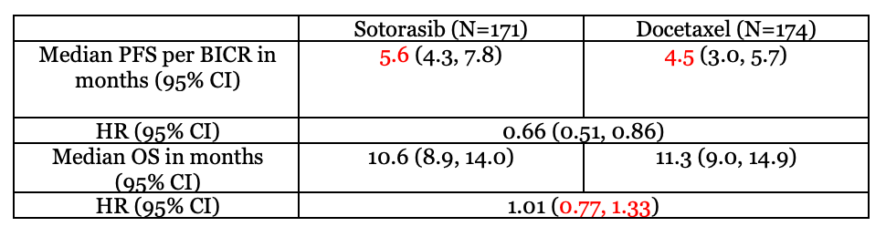 The median overall survival, OS, for both treatment arms are included in Table 1. The median OS for sotorasib is 10.6 months (95% CI: 8.9, 14.0). The median OS for docetaxel is 11.3 months (95% CI: 9.0, 14.9). The hazard ratio in the primary analysis is 1.01 (95% CI: 0.77, 1.33). As seen with the hazard ratio crossing one, the results are not statistically significant. At the time of the ODAC meeting, the FDA cited concern about a lack of improvement in OS with sotorasib treatment compared to docetaxel.