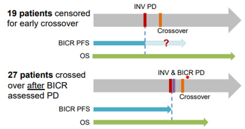 27 patients experienced crossover after BICR-assessed PD and started on new anti-cancer therapy. The FDA cited a concern because the new therapy may confound BICR assessments of disease progression. In addition, the sponsor completed an analysis of PFS by BICR for early crossover patients and patients who experienced crossover after both investigator and BICR assessment. At the time of the ODAC meeting, the median post-progression survival for early crossover patients was 18.9 months; the median post-progression survival for patients who experienced crossover after both investigator and BICR assessment was 11.8 months. The FDA then conducted its own exploratory comparison of survival and cited a concern of its analysis indicating that early crossover patients may be healthier than those who crossed over after BICR-assessment of PD, conflating the sponsor’s analysis of median post-progression survival.