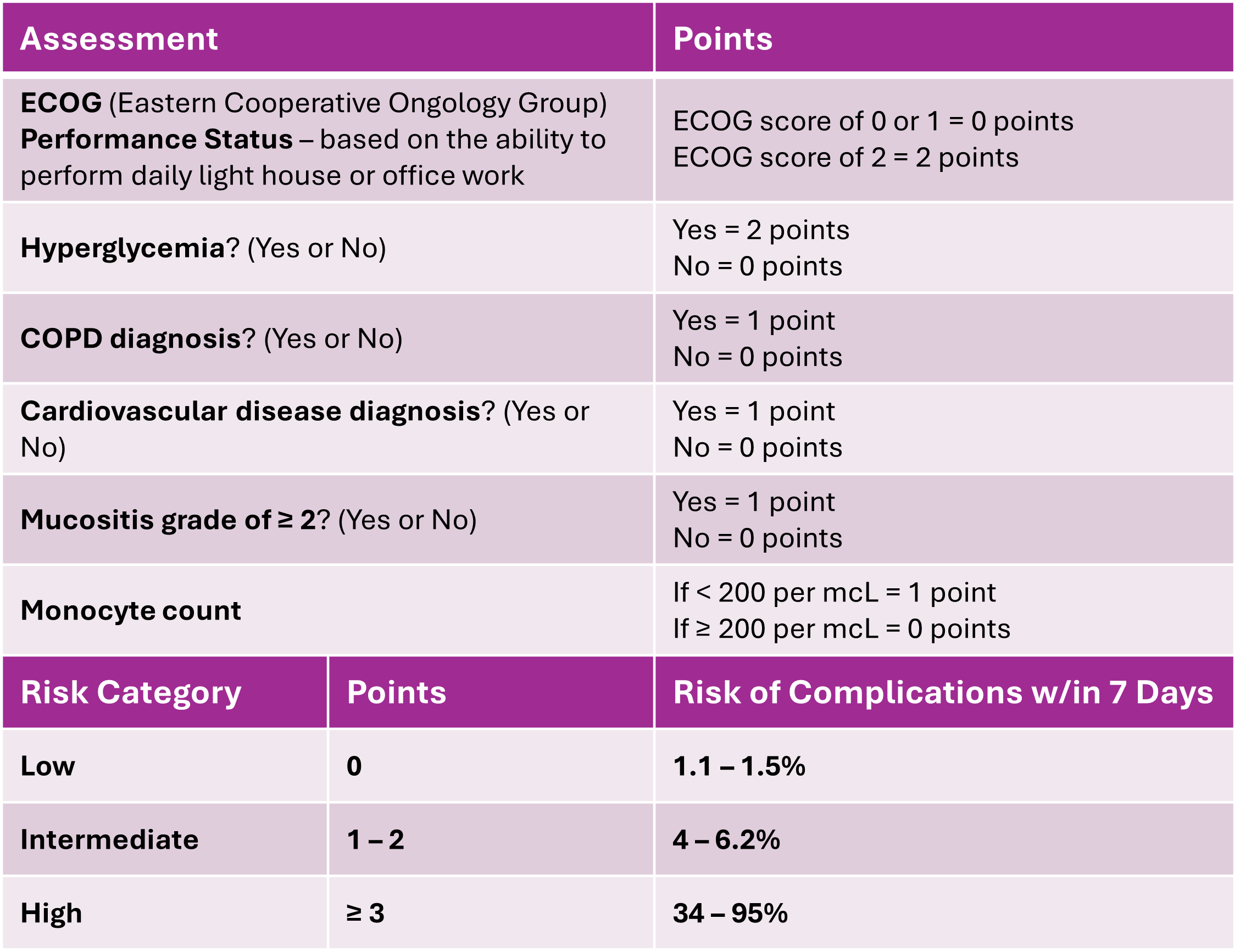 The MASCC Risk Index (5) is used to identify low-risk patients (score ≥ 21) for serious complications of FN (including death, intensive care unit admission, confusion, cardiac complications, respiratory failure, renal failure, hypotension, bleeding, and other serious medical complications). It was first created in 2000 during the MASCC study, an international collaboration to derive and validate a scoring system to identify low-risk patients for complications of FN (6). It consists of several assessments that the clinician performs: