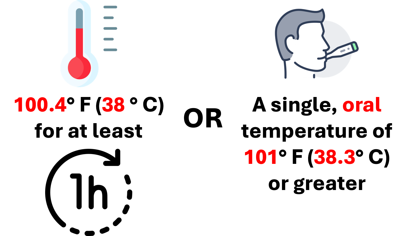 - A temperature of 100.4 F (38 C) for at least 1 hour, OR