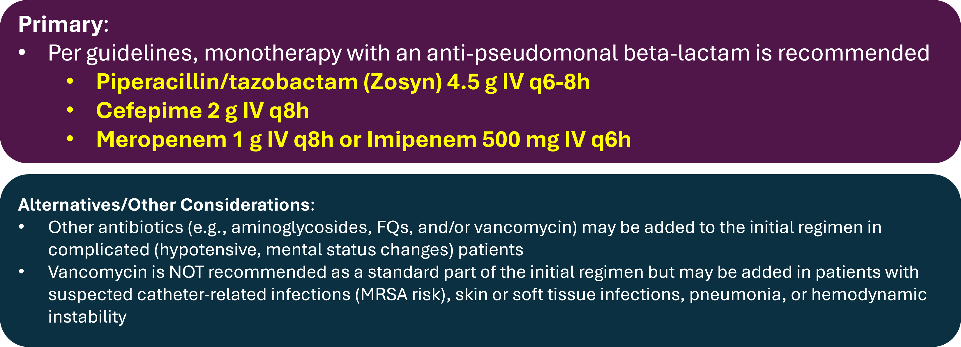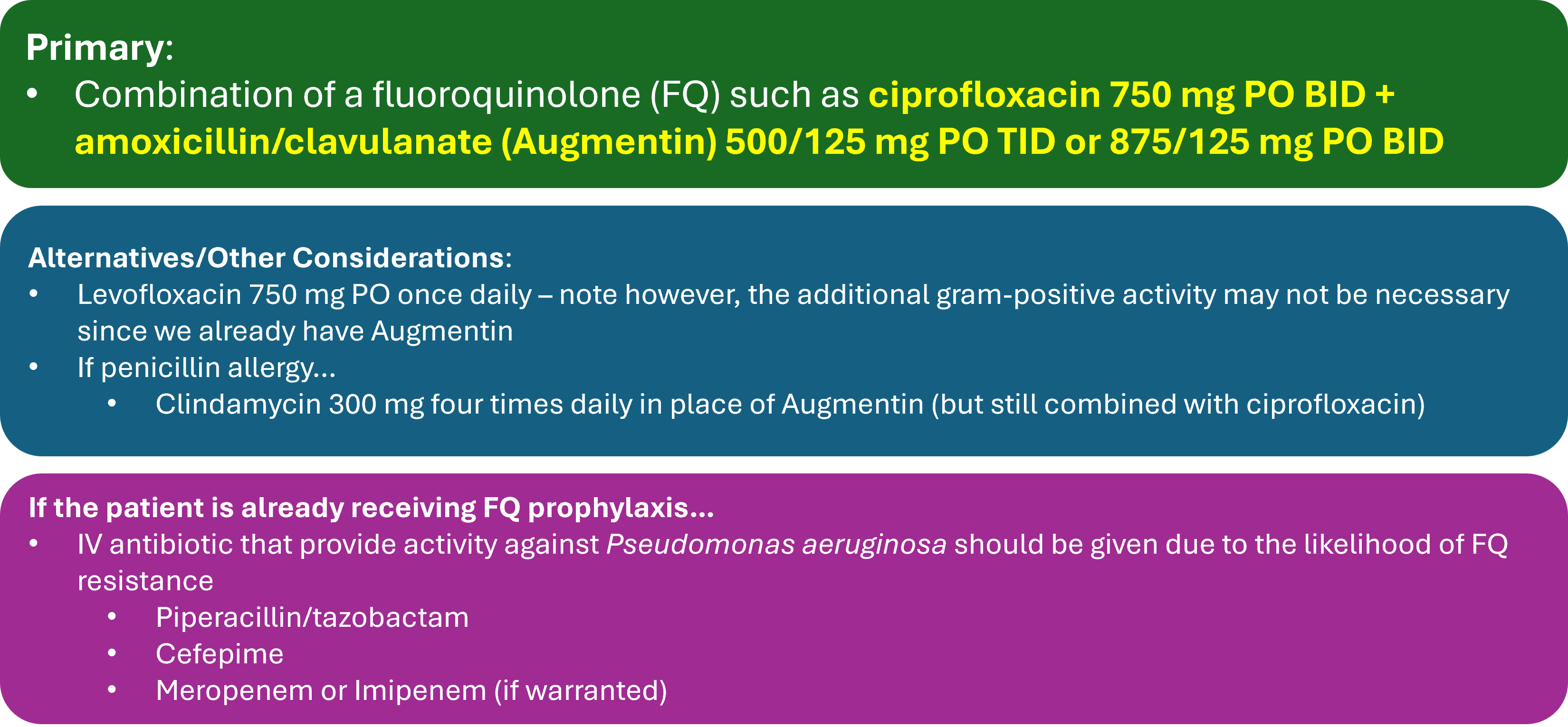 - For low-risk individuals, ciprofloxacin + Augmentin is sufficient, while in high-risk individuals it's recommended to administer an IV antibiotic such as piperacillin/tazobactam or cefepime for anti-pseudomonal coverage.