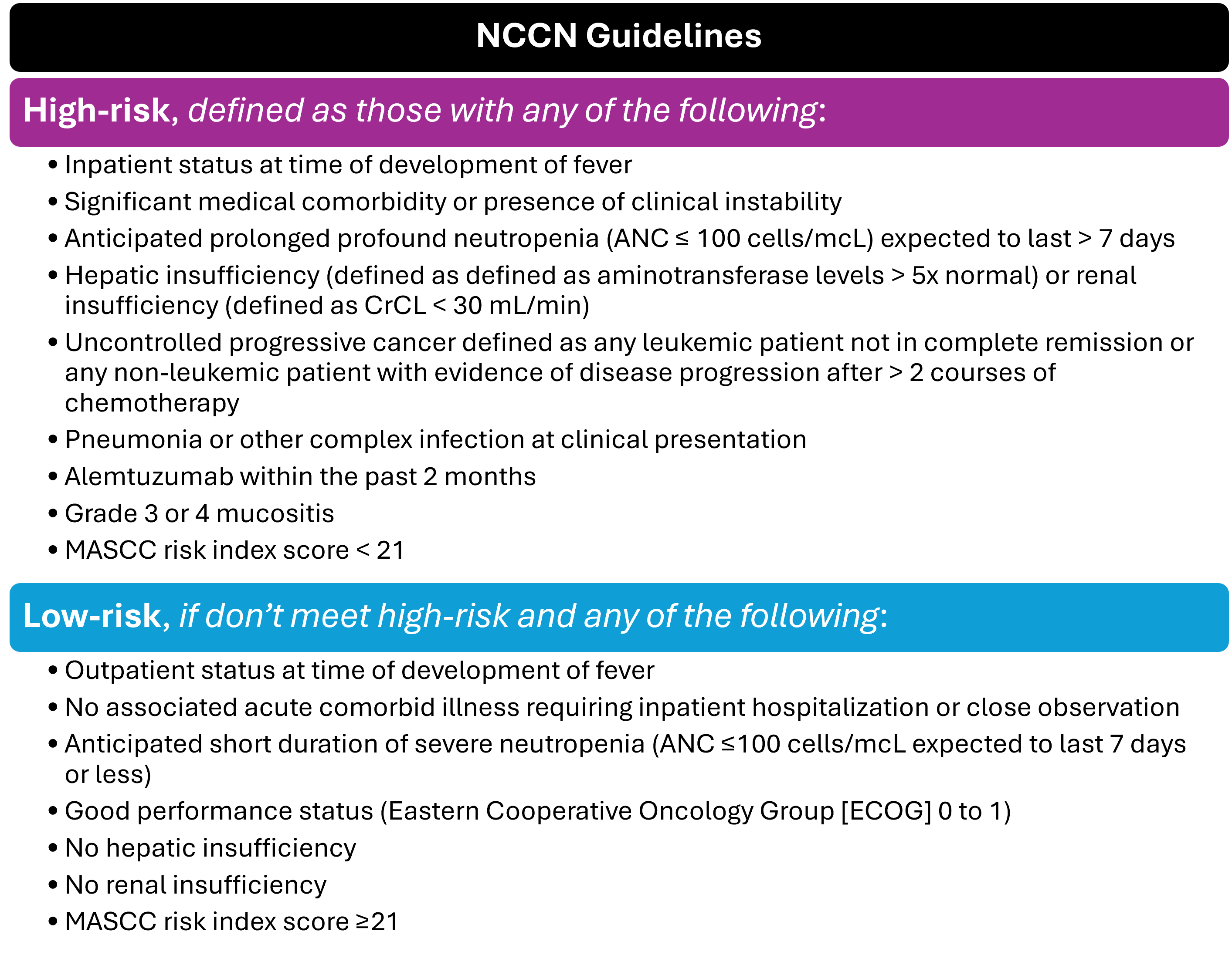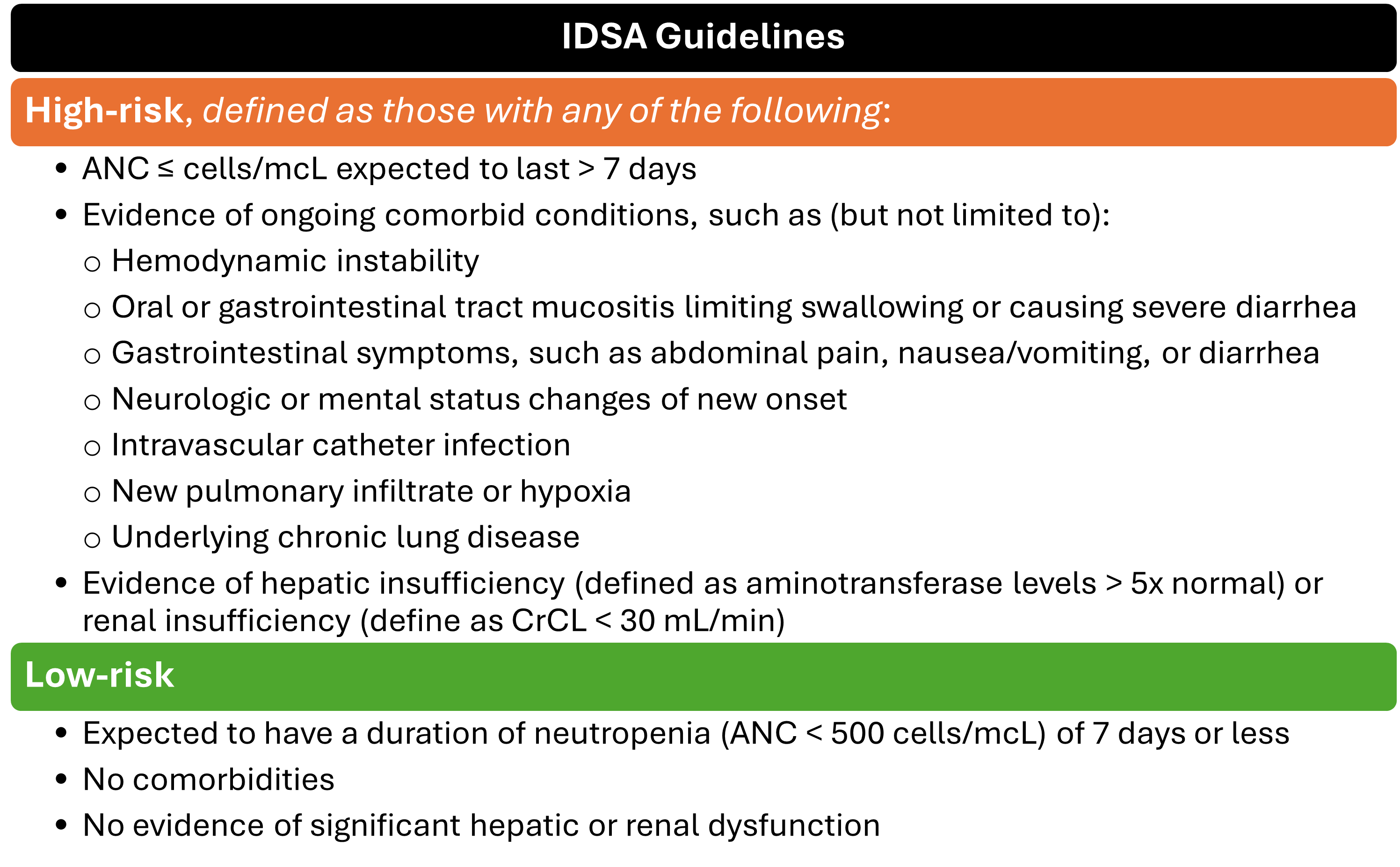 Notice and appreciate how both the IDSA and NCCN guidelines provide very similar risk assessment criteria for FN patients. The IDSA guidance dates back to 2010, while the NCCN guidance is newer and constantly being updated, with the last update in 2024. Take that information how you will.