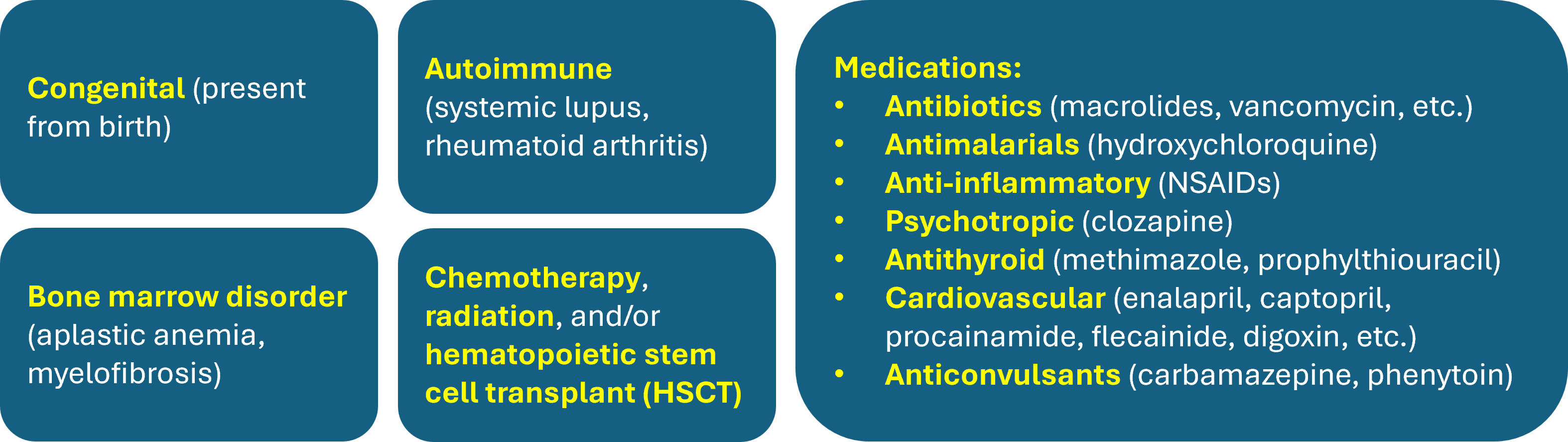 Infections aren't the only cause of FN. Other conditions and/or scenarios include congenital, autoimmune, bone marrow dysfunction or disorders, and of course, chemotherapy. Medications can also cause neutropenia through destruction of neutrophils or inhibiting the production of blood cells (hematopoiesis).