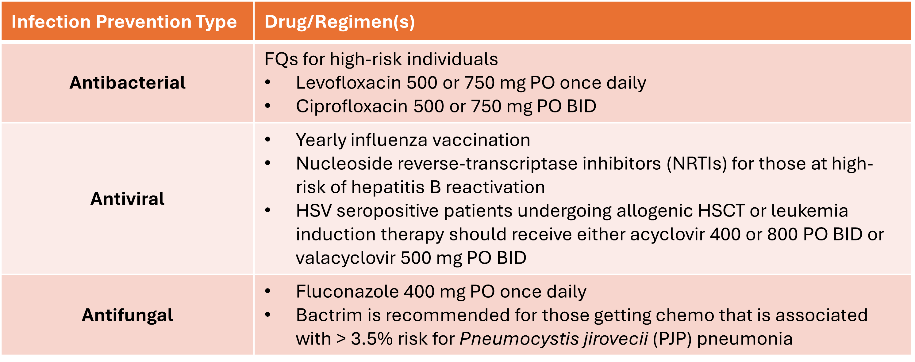 There is a TON of information regarding prophylactic regimens in FN patients and we won't go through that in this article, but here is some general guidance for high-risk individuals categorized by etiology: