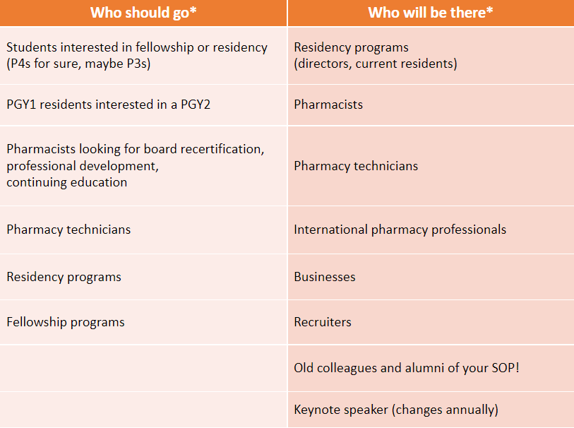 - Your Current Program Requires It: we discussed above that your program may require you to attend with a poster presentation, but your program also may require you to attend Midyear because your residency program has a booth at the Residency Showcase. This means almost zero stress for you! The biggest task is dressing in business clothes, standing on your feet for 2 hours, and answering questions from interested applicants. You will be discussing specifics of your residency program and your experience with rotations, preceptors, work load, responsibilities, etc. Try not to be too negative if you are currently really stressed and tired from your residency, but also be "real" with the students! Have a good pro/con list about your current residency experience to share with students who come up to your booth.
