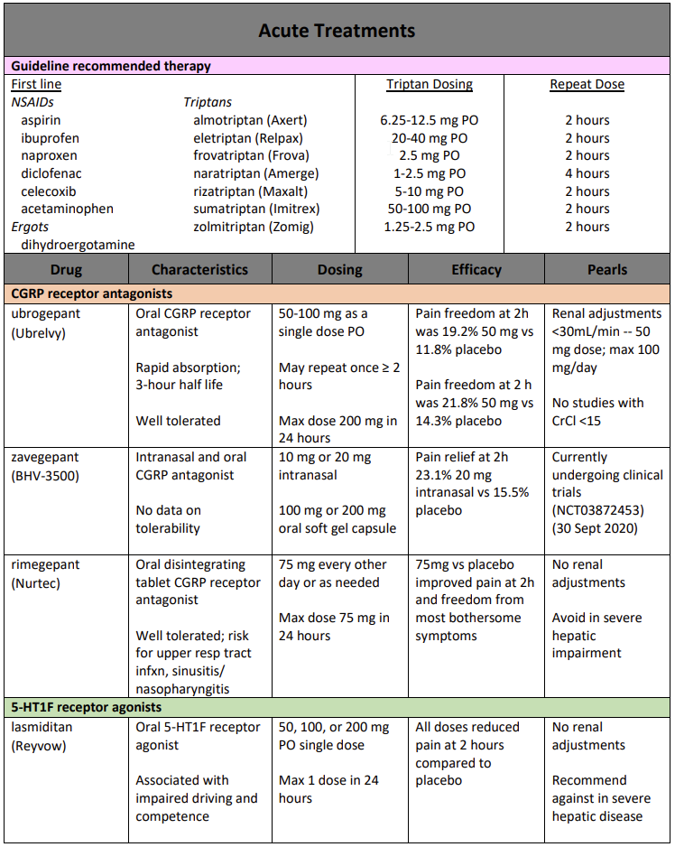 Quick topic discussion on migraine, pathophysiology, and tables regarding medication treatment options (for acute and preventative management).