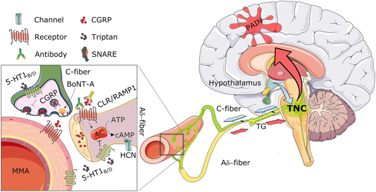 - Appears to mediate trigeminovascular pain transmission from intracranial vessels to the CNS as is vasodilatory component of the neurogenic inflammation