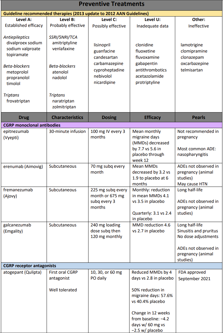 - Silberstein SD. Evidence-based guideline update: Pharmacologic treatment for episodic migraine prevention in adults. Published online 2012:12.
