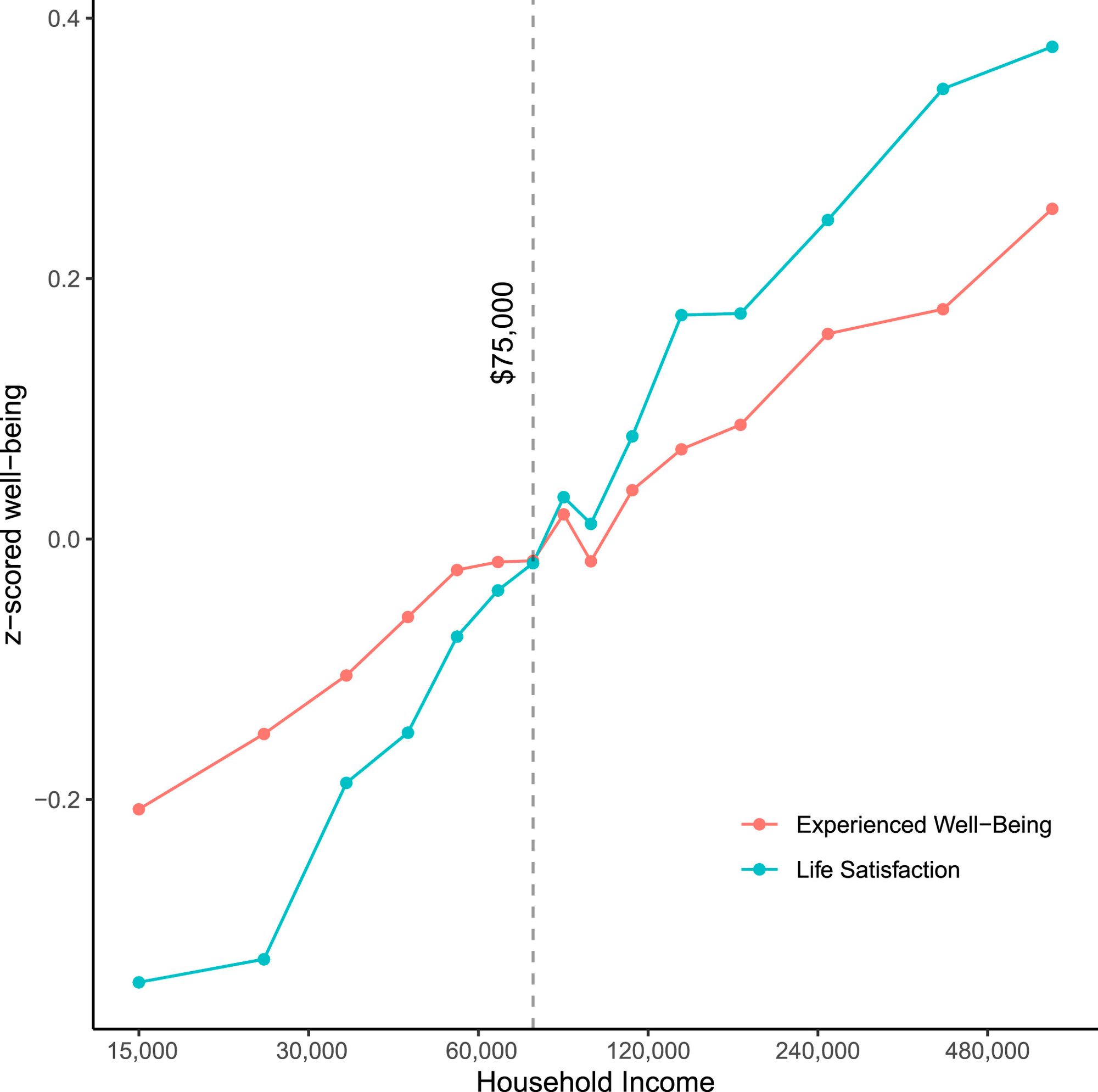 As you can see, in this dataset the $75,000 plateau disappears. Researchers chalk this up to differences in data collection techniques and survey response options.