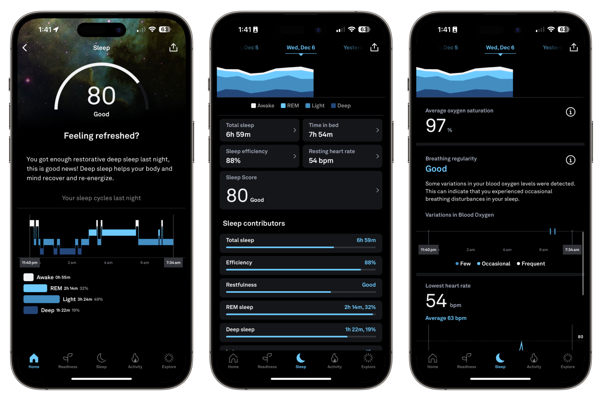 - Provides insights into sleep quality through a Sleep Score, highlighting areas for improvement.