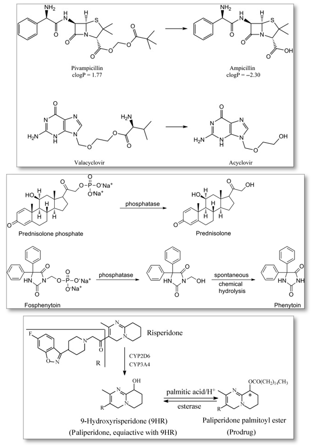 An ester bond is the most common form of prodrug linkage. Phosphate salts are the next most common. In Figure 1, Paliperidone palmitoyl ester conversion to 9-Hydroxyrisperiodone (9HR) is an example of an ester linkage. The conversion of prednisolone phosphate to prednisolone is an example of a phosphate salt.