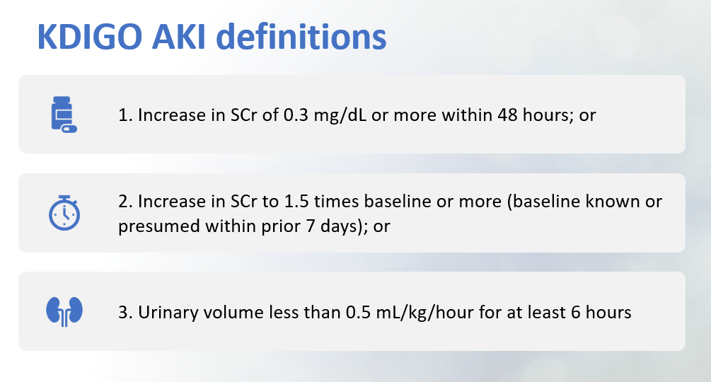 One of the first questions I was asked in residency was “what is the definition of acute kidney injury (AKI)?” I stared at my preceptor, speechless. I never thought about the textbook definition of AKI. A rough definition in my mind: a serum creatinine (SCr) that increased over a short period of time. Well, what "severity of increase” and what “period of time” would warrant a change in therapy in the clinical setting? We are going to cover this and more in this week’s clinical subtopic of nephrology!