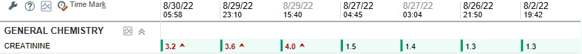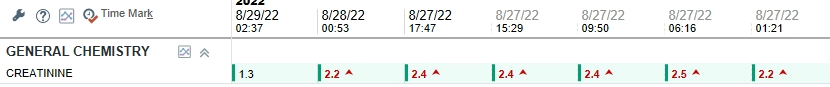 Watch out for IV contrast induced nephrotoxicity. Patient's often receive IV contrast for imaging in the hospital. Nephrotoxicity from contrast dye usually presents 2-5 days AFTER administration. The lab values in the screenshot below are from a patient who received contrast on 8/27 and developed AKI a few days later.