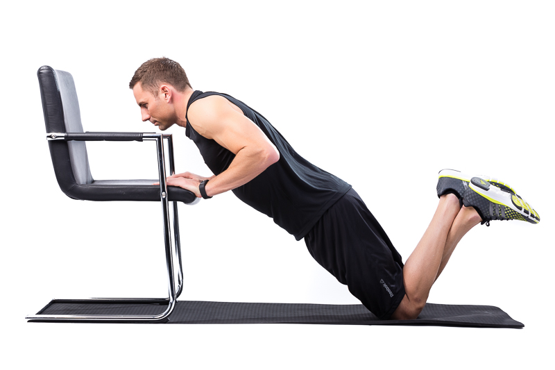 You can do dips on a set of parallel bars as well. You can find parallel bars in many parks and a dip station at most gyms if you want to try these! Simply hold yourself vertically in between the bars, lower yourself down until the back of your arms are parallel to the ground, then push back up. As a beginner, you will likely need assistance with these in the form of a band or (depending on the height of the bars) you can place one foot on the ground and use it to help push yourself up. To make these into "chest dips" simply lean forward so that your body is no longer completely vertical, then hold that angle on the way up and down. This will greatly enhance the strain on your chest!