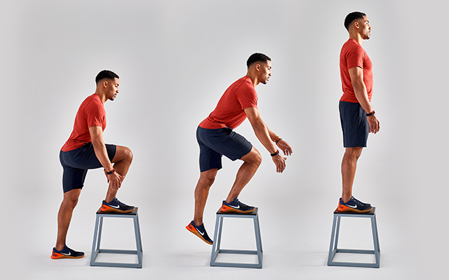 2. Box Step-Ups: These are as effective as they are simple. Similar to squats, box step-ups work the 3 major muscle groups in your legs and also put a little more emphasis on your calves. For this movement, you'll need a bench, chair, table, or anything else strong enough to hold your weight.