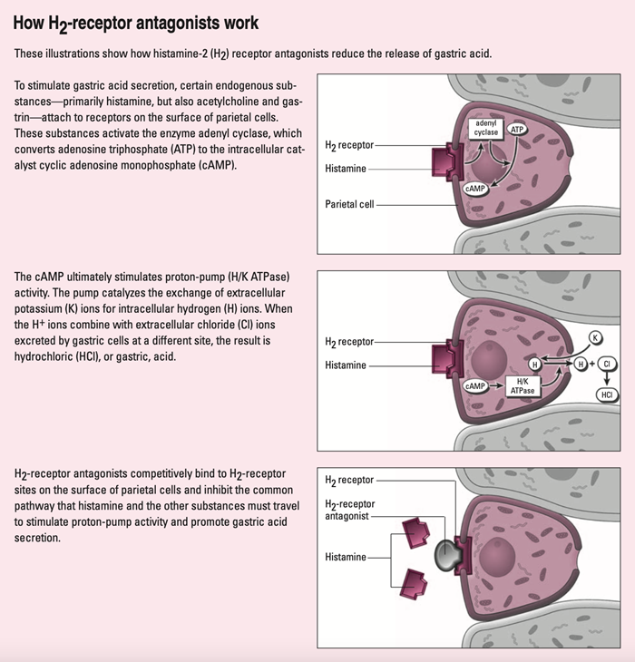Ranitidine is a histamine type 2 receptor antagonist, reversibly blocking the production of hydrochloric acid in the stomach to provide relief from heartburn and GERD, as well as duodenal ulcers and other issues associated with gastric hyperacidity.2 Ranitidine works the same way as both cimetidine (Tagamet) and the much more popular famotidine (Pepcid). See Figure 1 below for a visual representation of the mechanism of action of these drugs.