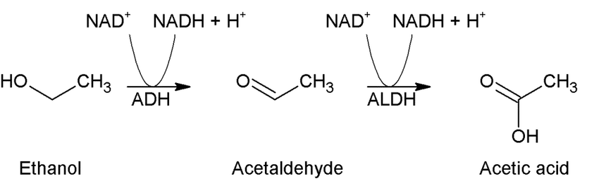 This is the general process for metabolizing many different compounds, including several drugs. The more polar (charged) a molecule becomes, the better the body is at getting rid of it through the kidneys. The process of making molecules more polar is often dependent on enzymes, like ADH and ALDH. For the non-scientists reading this, if a weird-looking chemistry word ends in "-ase", it's probably an enzyme! Names of different enzymes often speak to their actual function. For instance, dehydrogenase is an enzyme that removes a hydrogen.