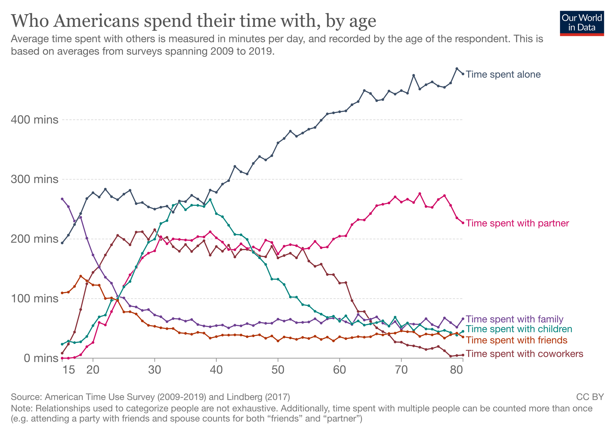 By the time you turn 59 years old, the time you spend with your children will be 4 times less on average than when you were 39. This tends to be one statistic that many parents wish they could change. This is also the age when time with co-workers starts to steadily decline and time with your partner takes a sharp incline towards its peak at 73 years of age.